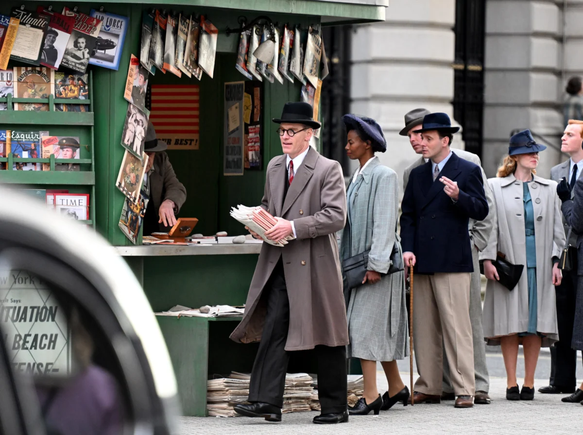 The presence of background actors and co-stars further enriches the period setting. Men in sharp pinstriped and navy double-breasted suits, often smoking cigarettes, are seen alongside women adorned in elegant, structured coats and stylish hats, carrying period-appropriate portfolios and handbags. Even military personnel in naval uniforms are visible in the background, collectively painting a vivid picture of American life during the 1940s, a period marked by both the anxieties and resolve of a nation at war.